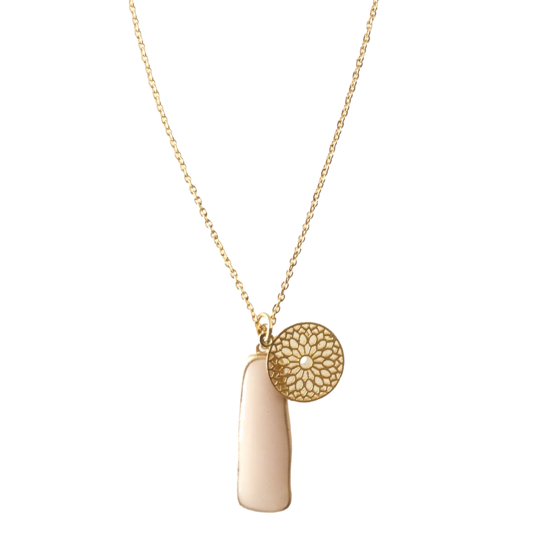Collar de cadena de plata bañada, pieza de esmalte y charm. Largo de la cadena 32cm