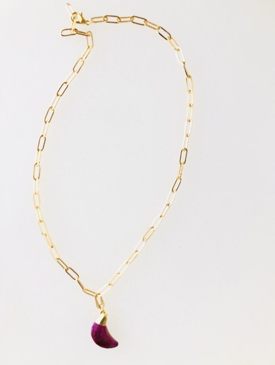 Collar de eslabones de metal bañado y pieza de ágata roja en forma de media luna. Largo de la cadena 22cm