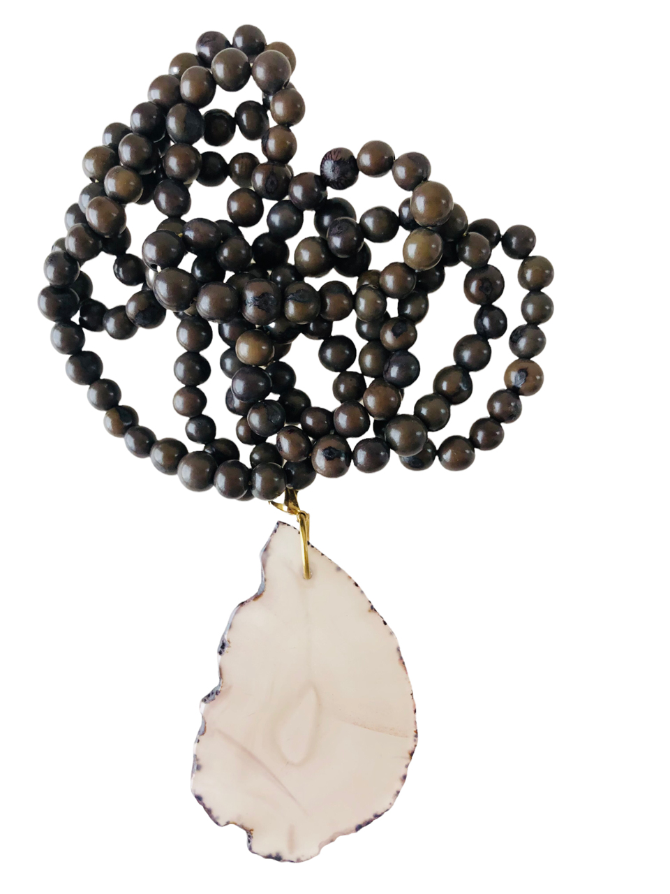 Collar de semillas y ágata para llevar con una o dos vueltas. La piedra se puede separar mediante un mosquetón para recolocarla y que el cierre quede siempre detrás, o poder llevar el collar y el colgante por separado