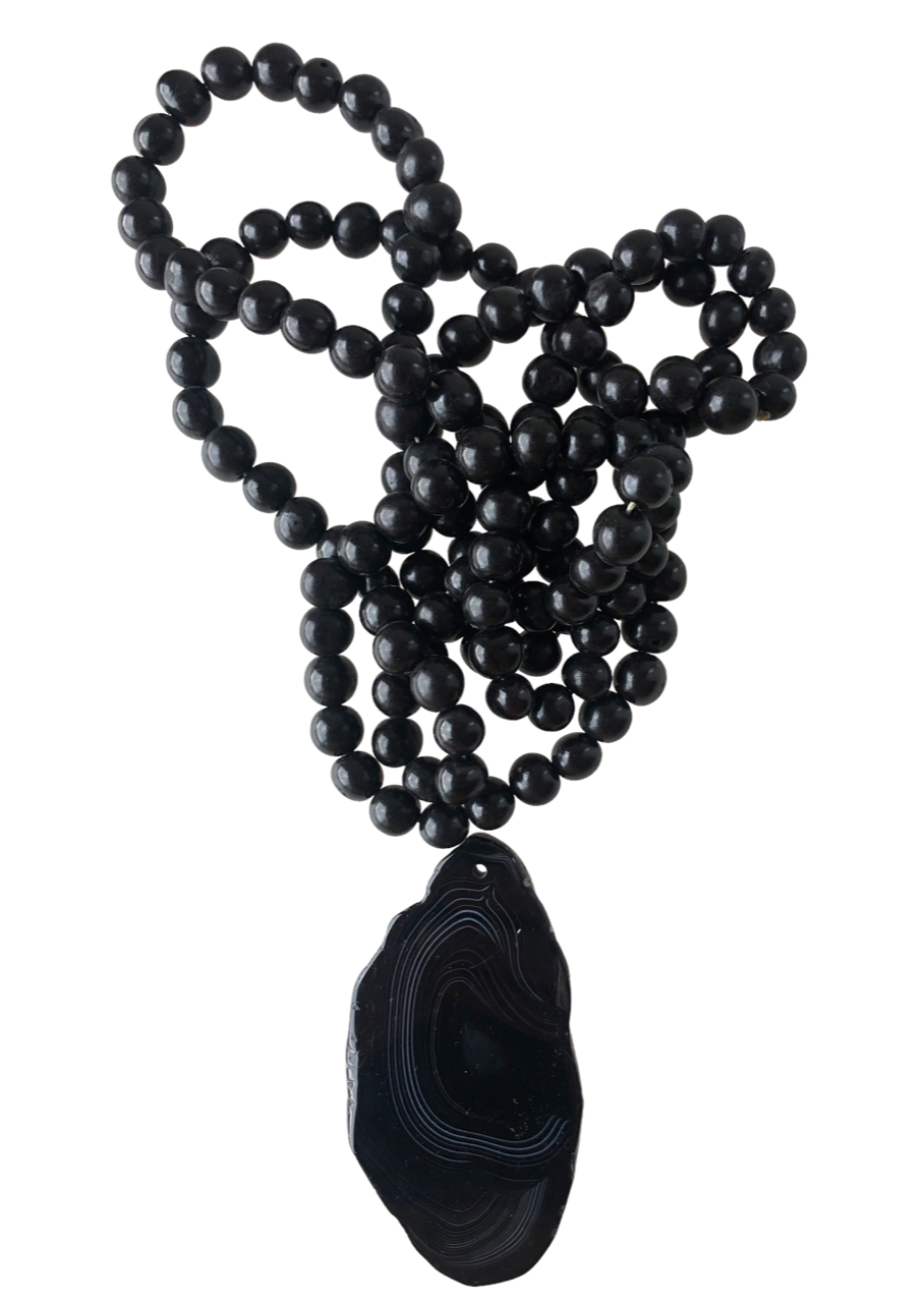 Collar de semillas y ágata para llevar con una o dos vueltas. La piedra se puede separar mediante un mosquetón para recolocarla y que el cierre quede siempre detrás, o poder llevar el colgante y el collar por separado