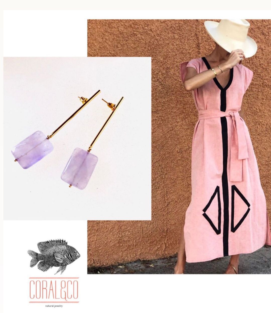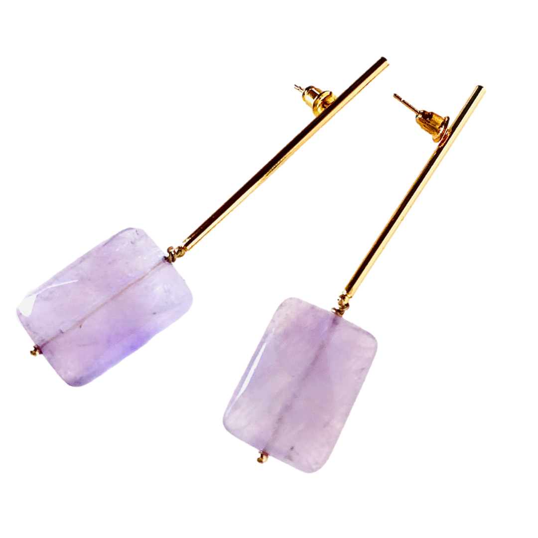 Pendientes de amatista rectangular y base de plata bañada en oro. Largo 6 cm